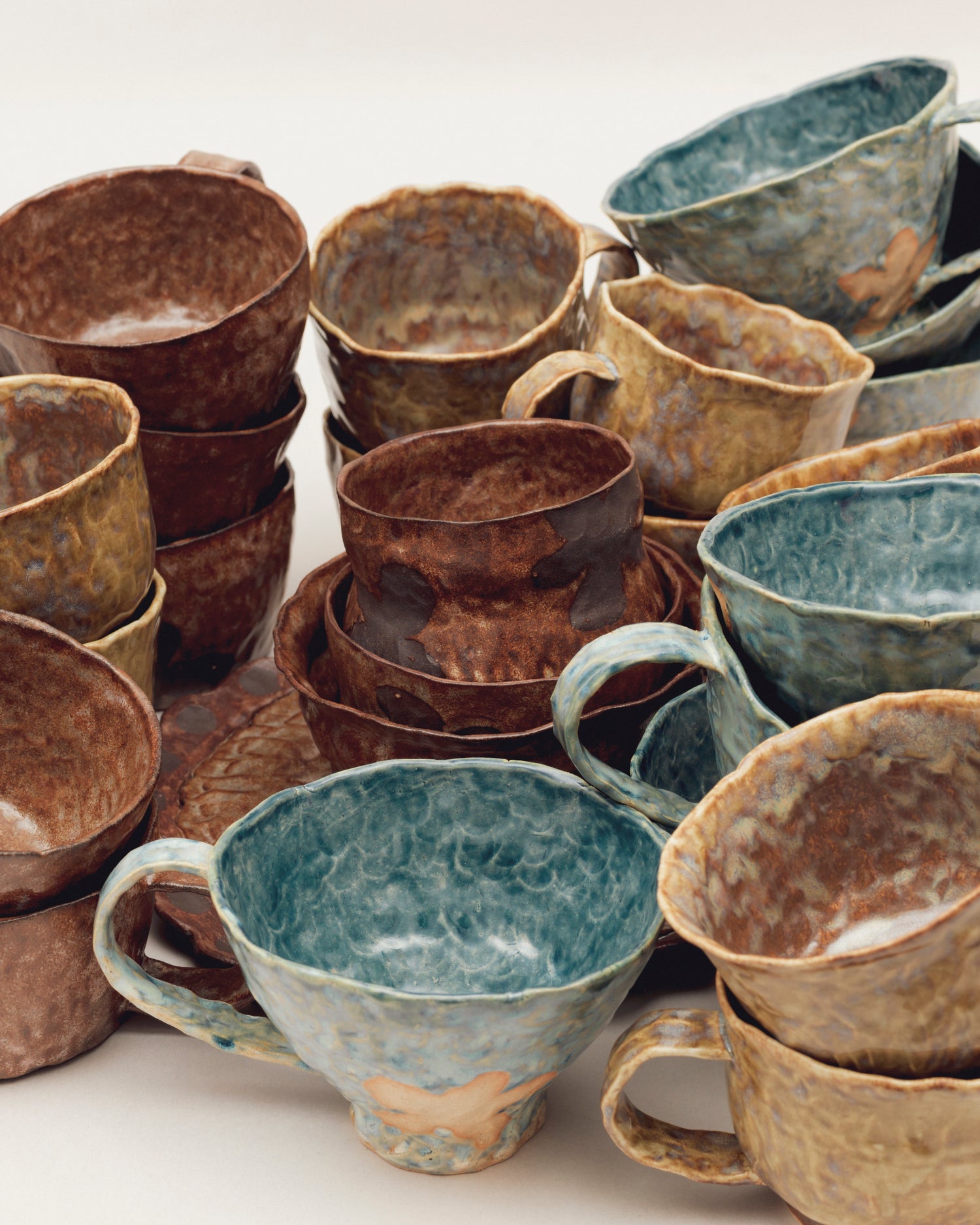 Mimi creates both functional wares and larger sculptural pieces, including furniture-inspired forms that blur the line between utility and art. Inspired by the textures and movement of nature—particularly sand and water—her pieces embody a tactile and meditative quality.