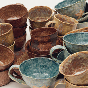 Mimi creates both functional wares and larger sculptural pieces, including furniture-inspired forms that blur the line between utility and art. Inspired by the textures and movement of nature—particularly sand and water—her pieces embody a tactile and meditative quality.